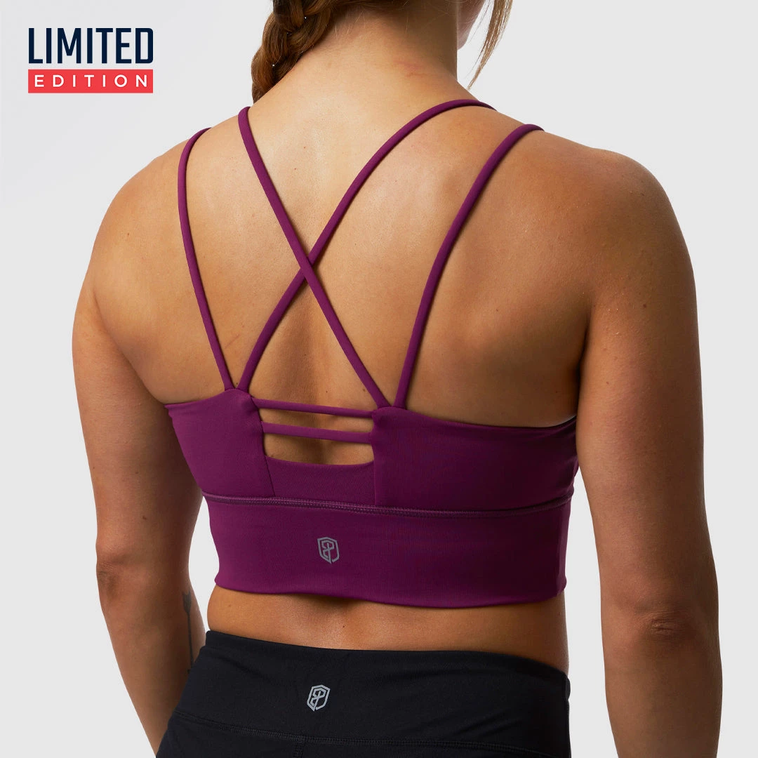 The Bridge the Gap Sports Bra features a medium coverage front with a thick bottom band. There are thin dual straps on each shoulder of this women’s magenta strappy sports bra.