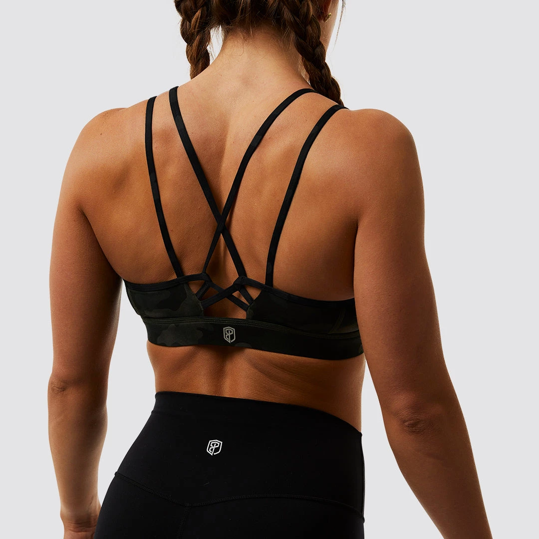 The Lotus sports bra features a cute and unique back with 4 straps. The front offers moderate coverage and a traditional style band around the bottom.