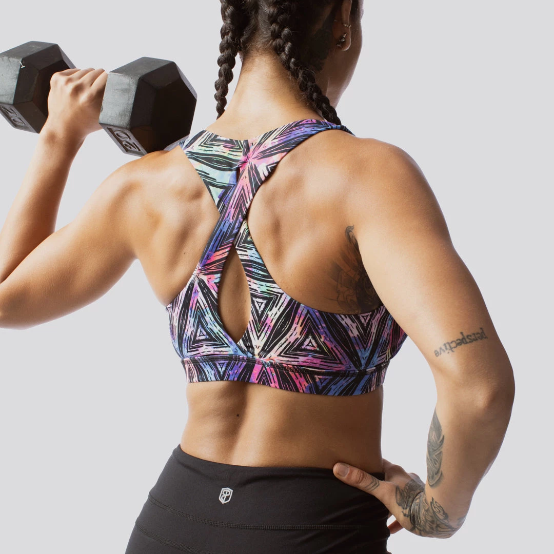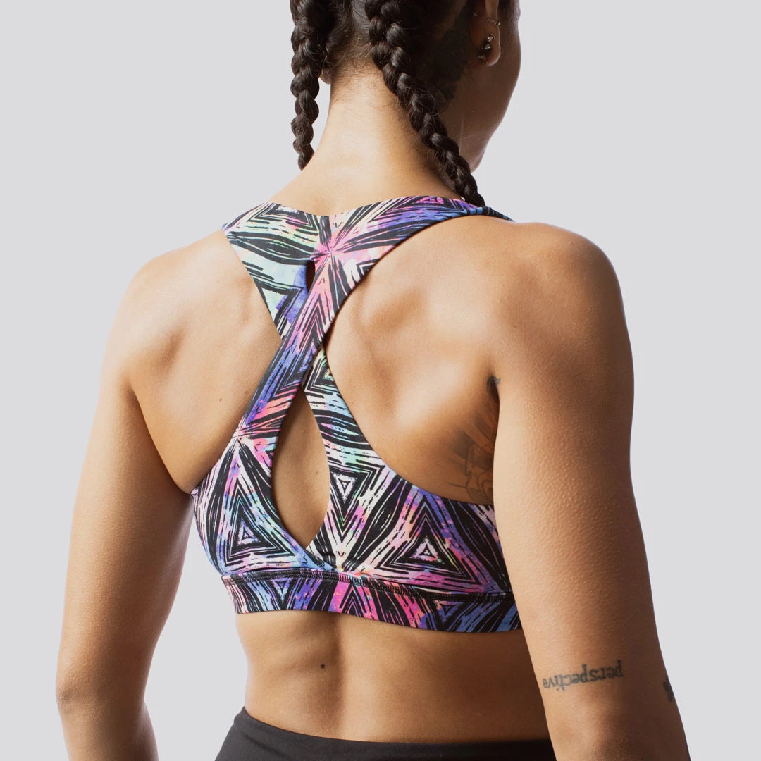 The infinity sports bra features a nylon/lycra fabric blend that is comfortable, supportive and allows this rainbow prism sports bra to move with you. The sports bra features a moderate coverage front and a cute keyhole in the back.