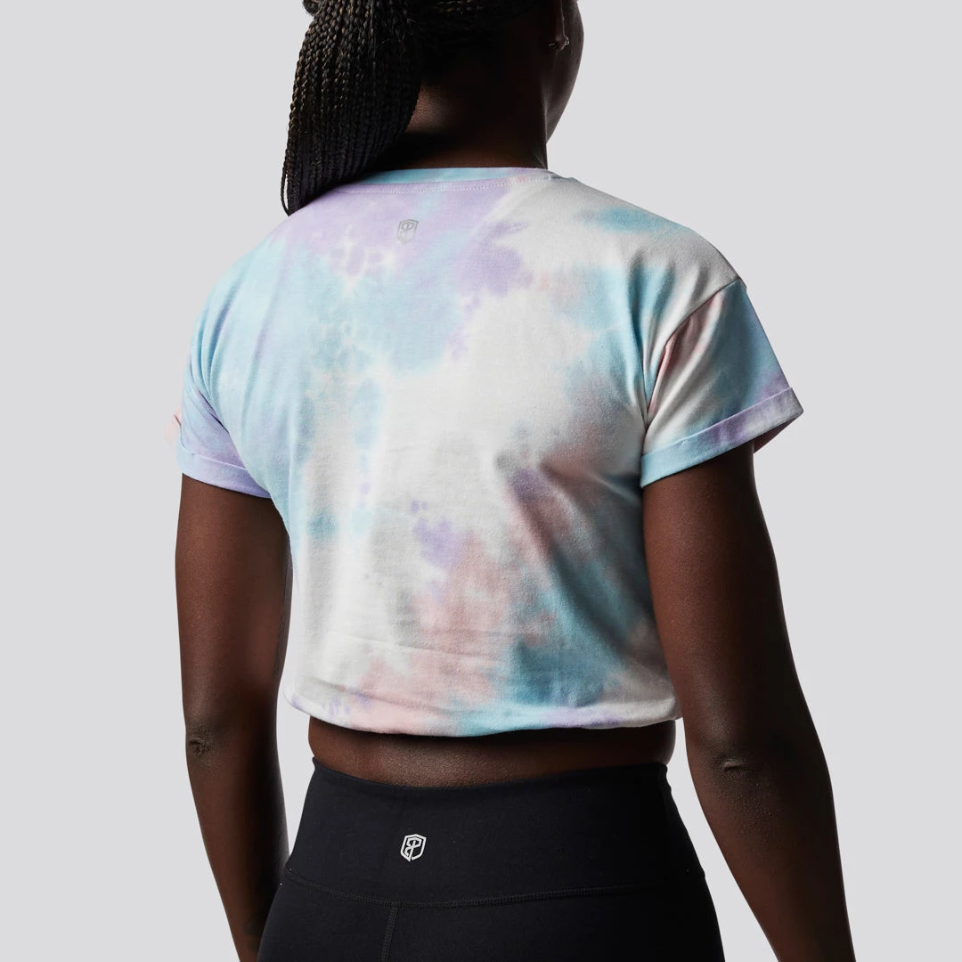 This pastel tie dye crop top features cuffed sleeves and a cropped length drawstring bottom.