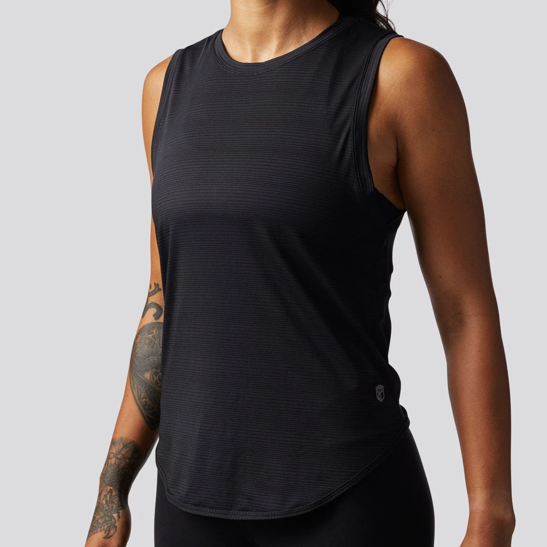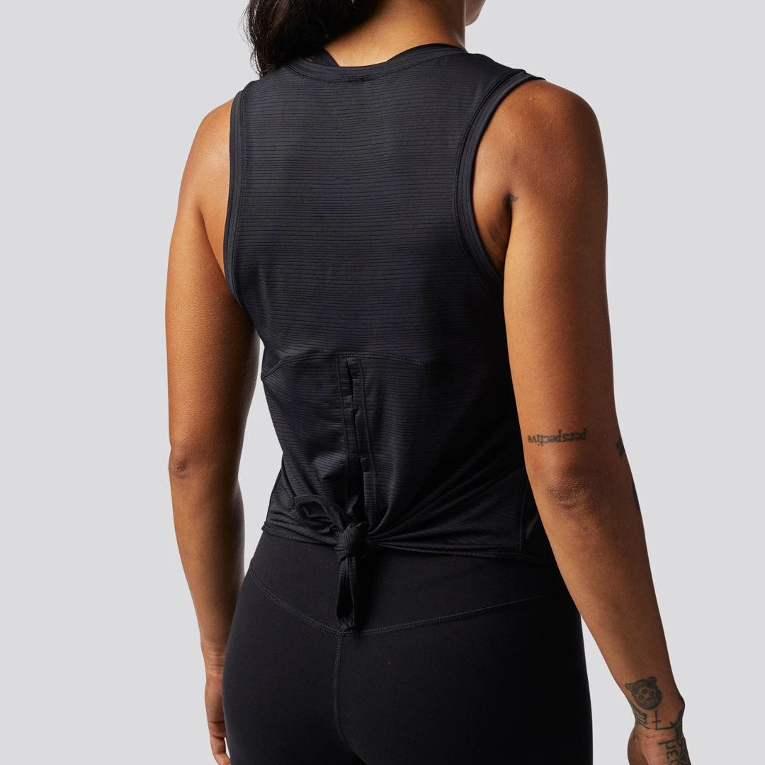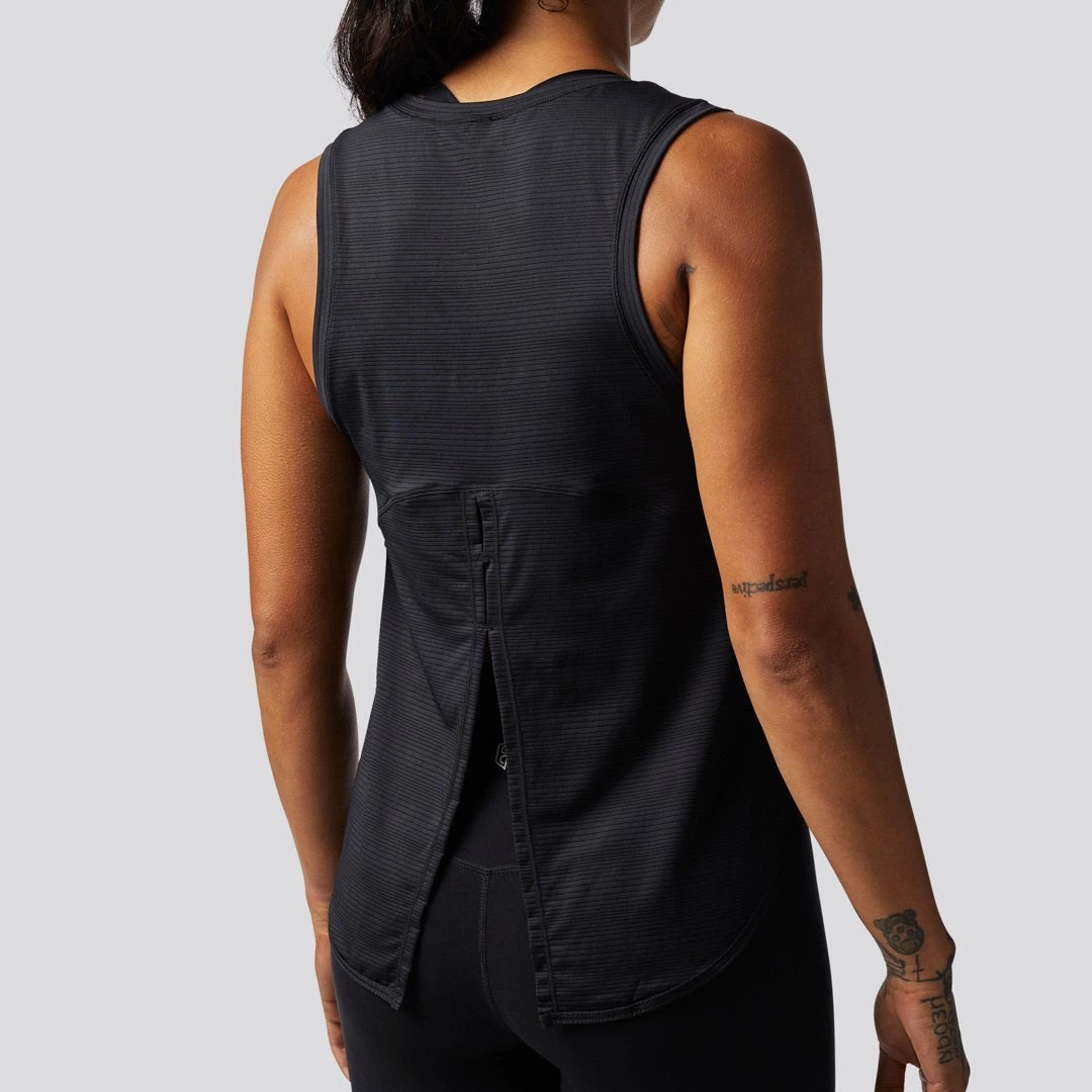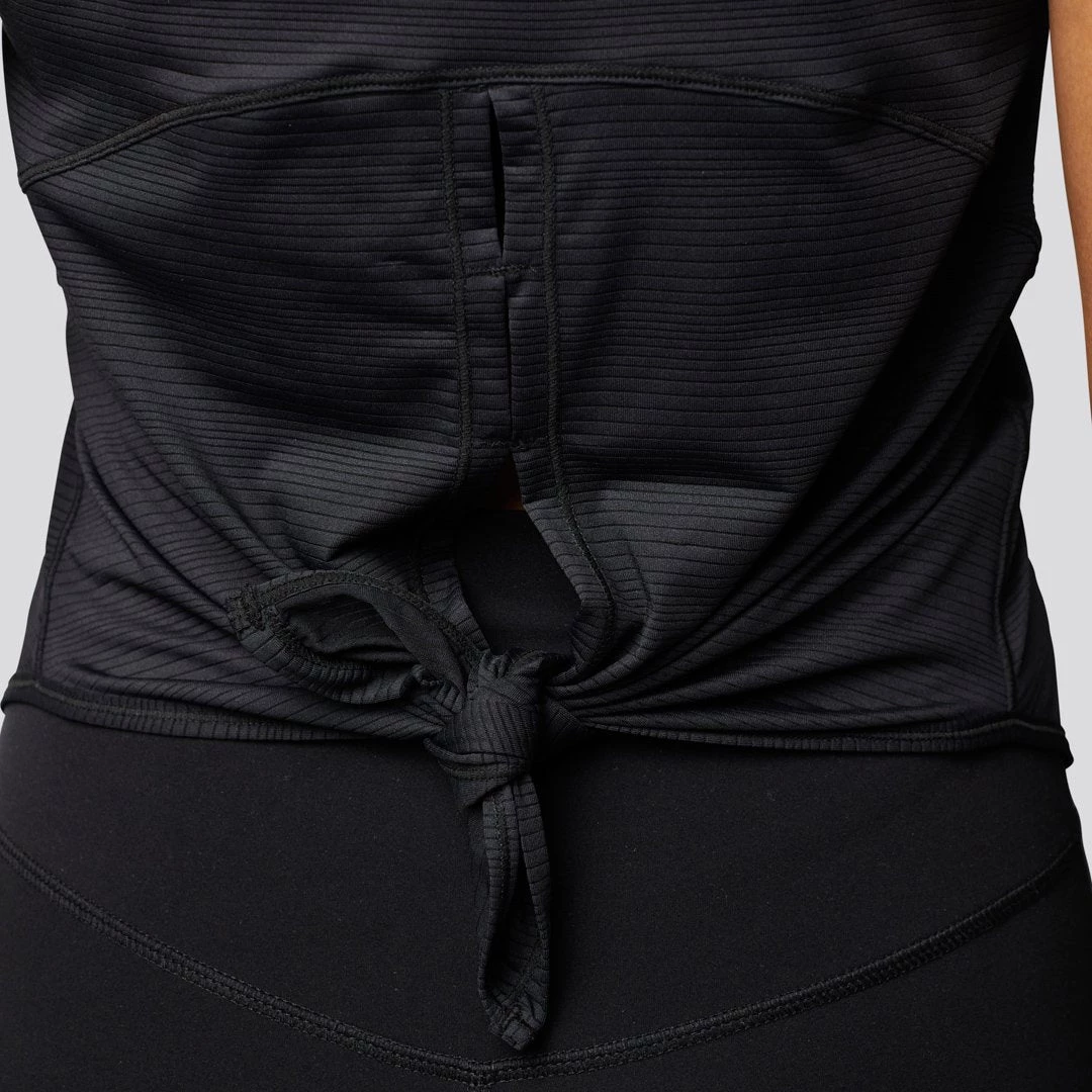 The Dusk to Dawn Tank features a striated material that is super light and breathable. This women’s black workout tank top features a rounded bottom and a slit halfway up the middle of the back that you can tie or leave open for a flowy look.