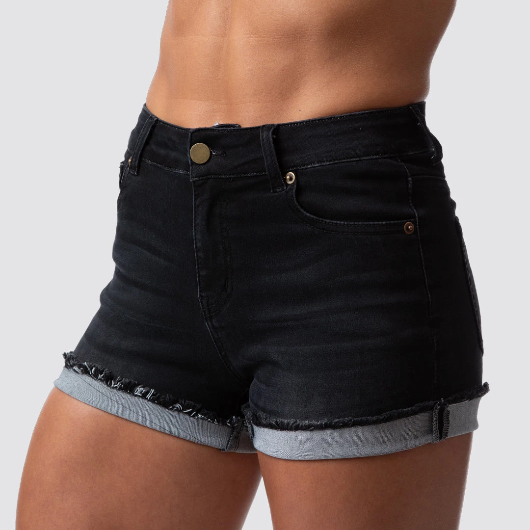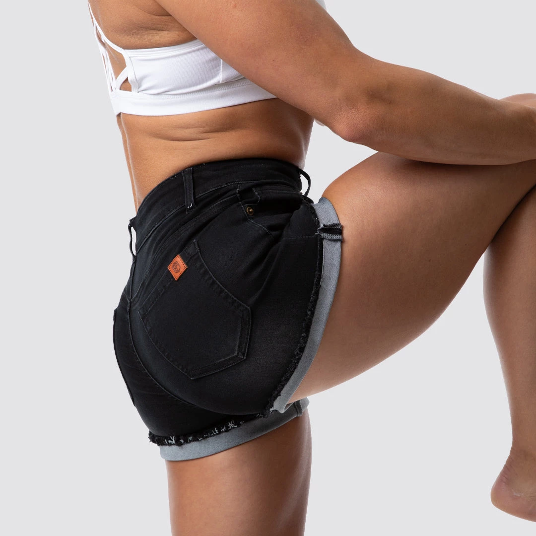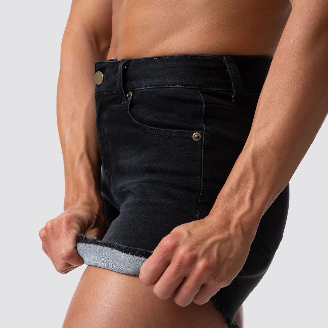 A staple in every wardrobe is jean shorts. Introducing Born Primitive Flex Stretchy Jean Shorts! These jean shorts feature an even stretchier and softer denim material from our original shorts & these are designed for the athletic female body. These jean shorts feature a black wash, a mid-rise waist and a 3″ inseam with a fringe bottom that can be worn down or folded and rolled up. These shorts are incredibly soft and stretchy—the most comfortable pair of jean shorts you will ever wear!