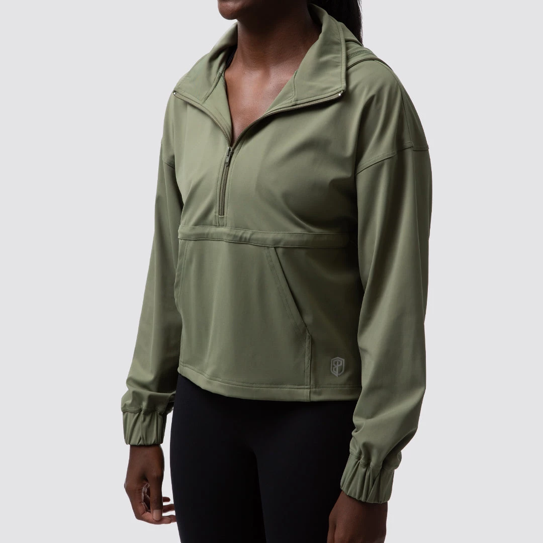 The Weekender Pullover features an amazing new material that is soft and stretchy. This pullover has a 1/2 zipper, a hood and a pouch pocket in the front. There is also a slide cinch around the rib cage. This pullover hits right around the waist.