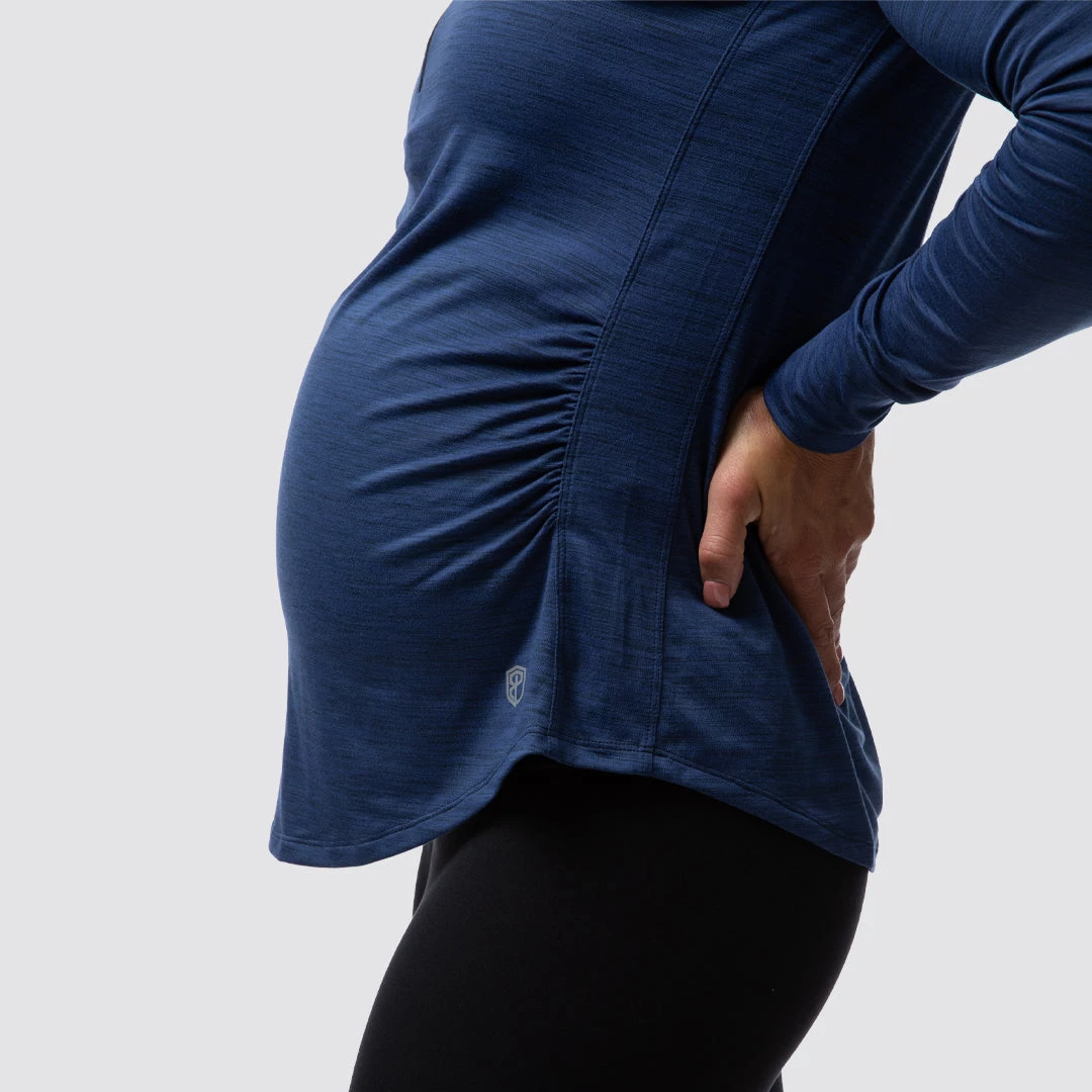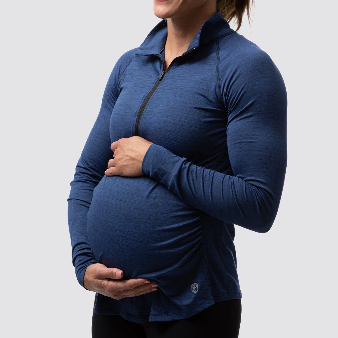 The Maternity Zip Neck Athleisure Long Sleeve features our favorite premium, super-soft yet sturdy material with a 1/4 zipper in the front. The sides have elastic and runching to allow for room to grow with you. This navy blue long sleeve maternity shirt provides versatility to your wardrobe, being able to be worn in a variety of settings.