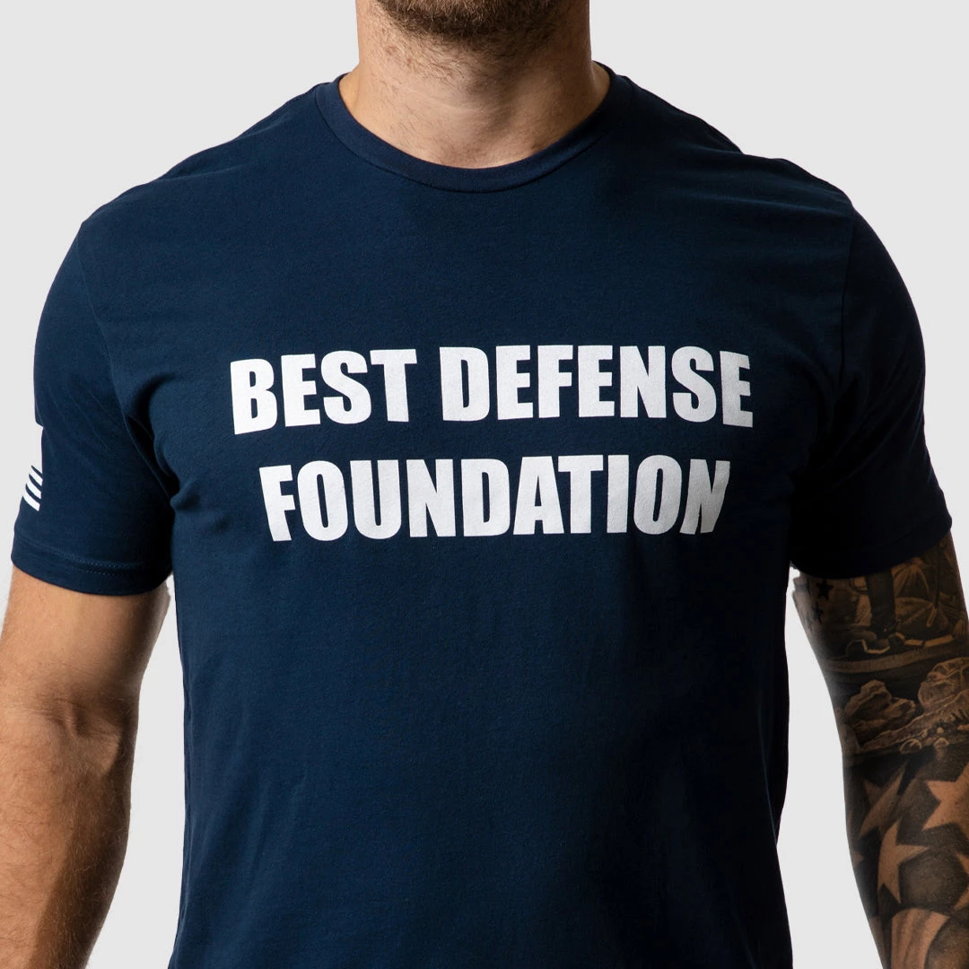 This ultra soft sueded tee in midnight navy features the Best Defense Foundation on the front and their logo on the back.