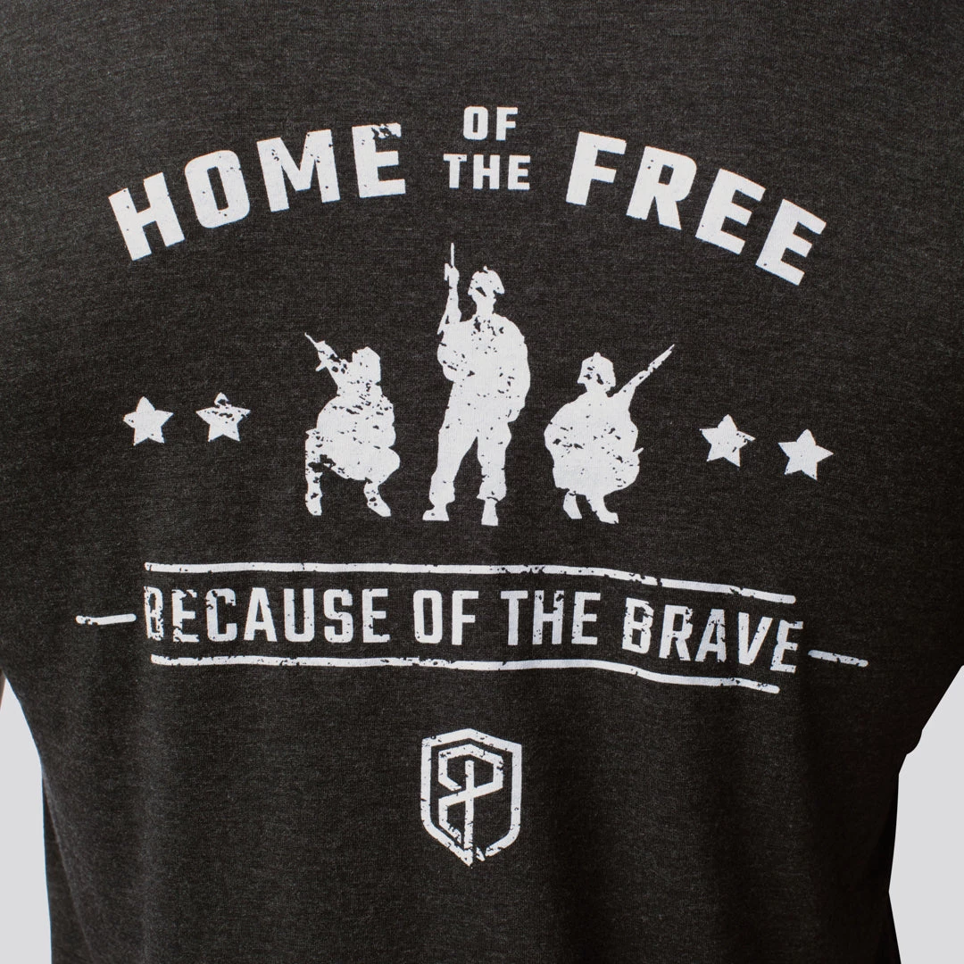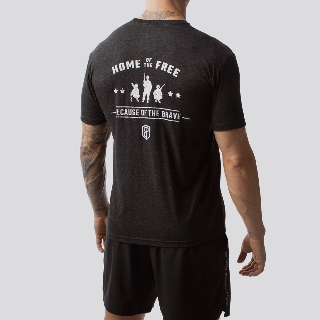 Our Home of the Free Because of the Brave t-shirt features a flag on the left chest and large picture and saying on the back.
