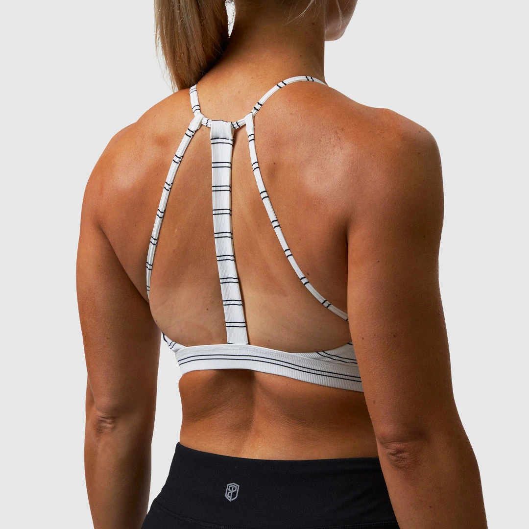 The Perseverance Sports Bra is a part of our AScudds GRIT Collection. This white and black sports bra was curated by Alison herself and features a halter neck and open back design that offers maximum coverage. This pinstripe bra can be worn on its own or layered with open-back tanks and tees.