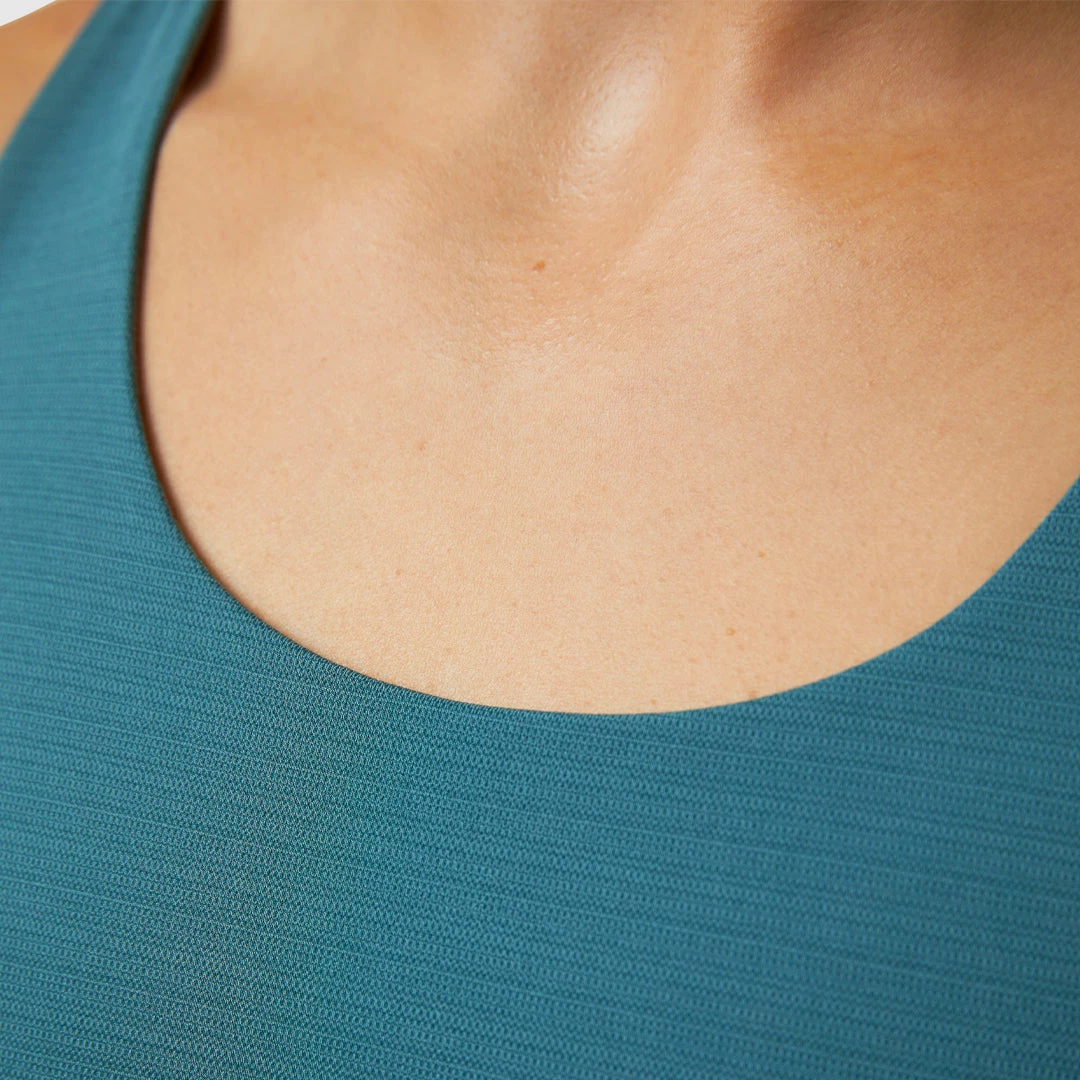 The Rise Flex Sports Bra features a new fabric that has a subtle stripe design. This sports bra features an extended body fit with a thick lower band and straps that form a V-shape in the back.