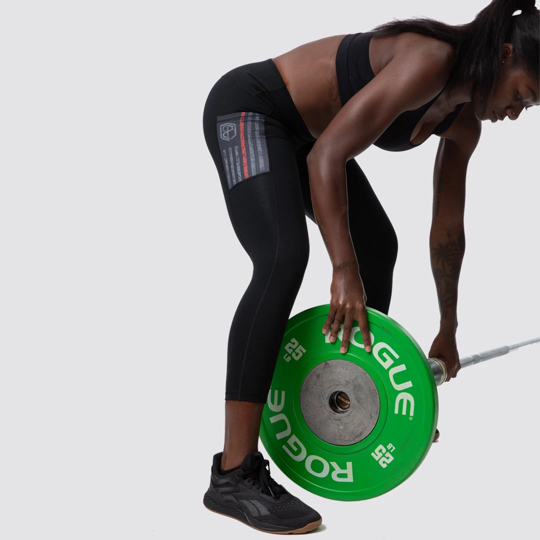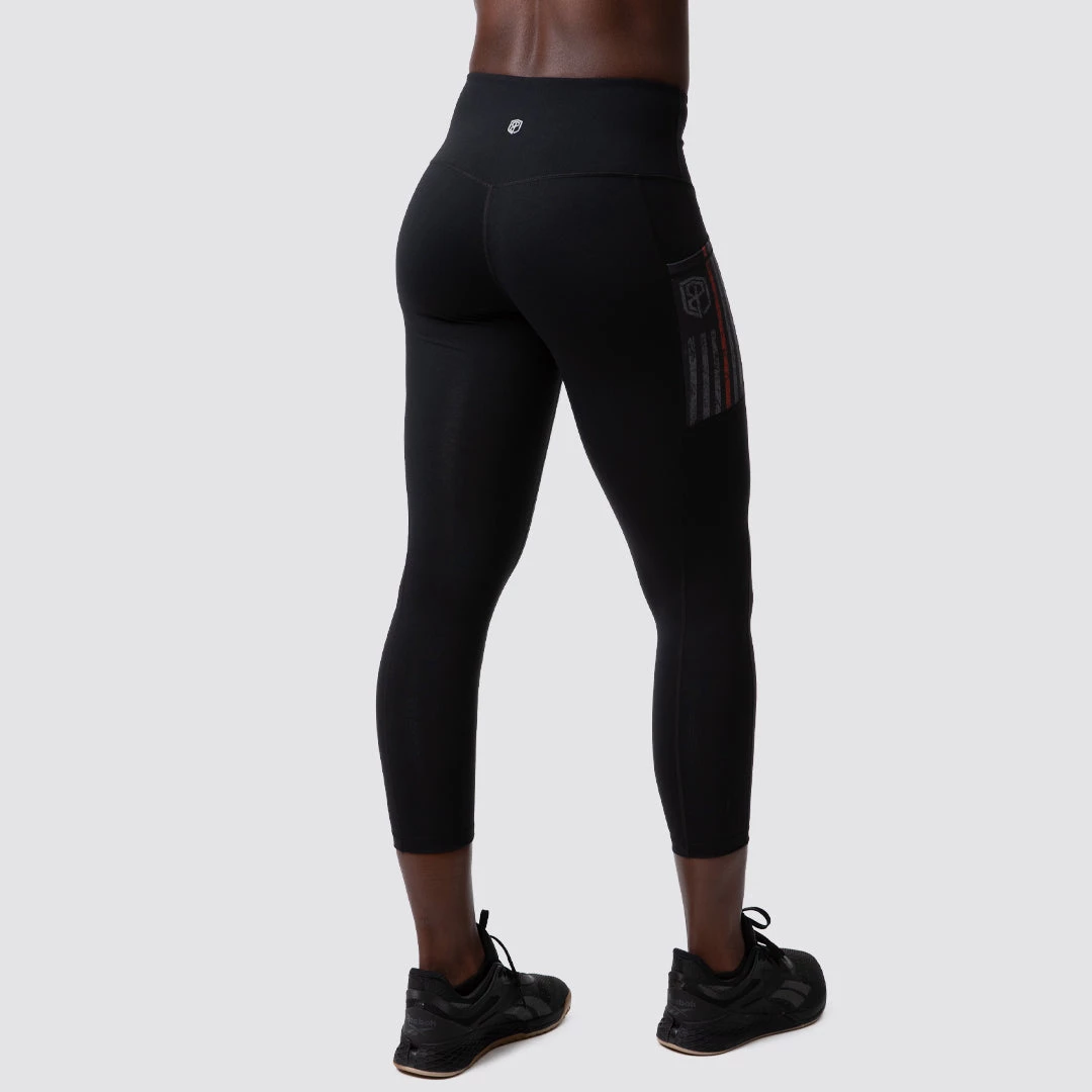 Rise & Grind black workout capri pants feature dual pockets on both outer thighs with a Thin Red Line flag in Gunmetal and a wide waist band that you won’t have to constantly adjust. These capris offer a form fitting supplex material- feel of cotton with the benefits of advanced fiber technology. These are a “longer capris” and will hit mid-calf versus just below the knee!