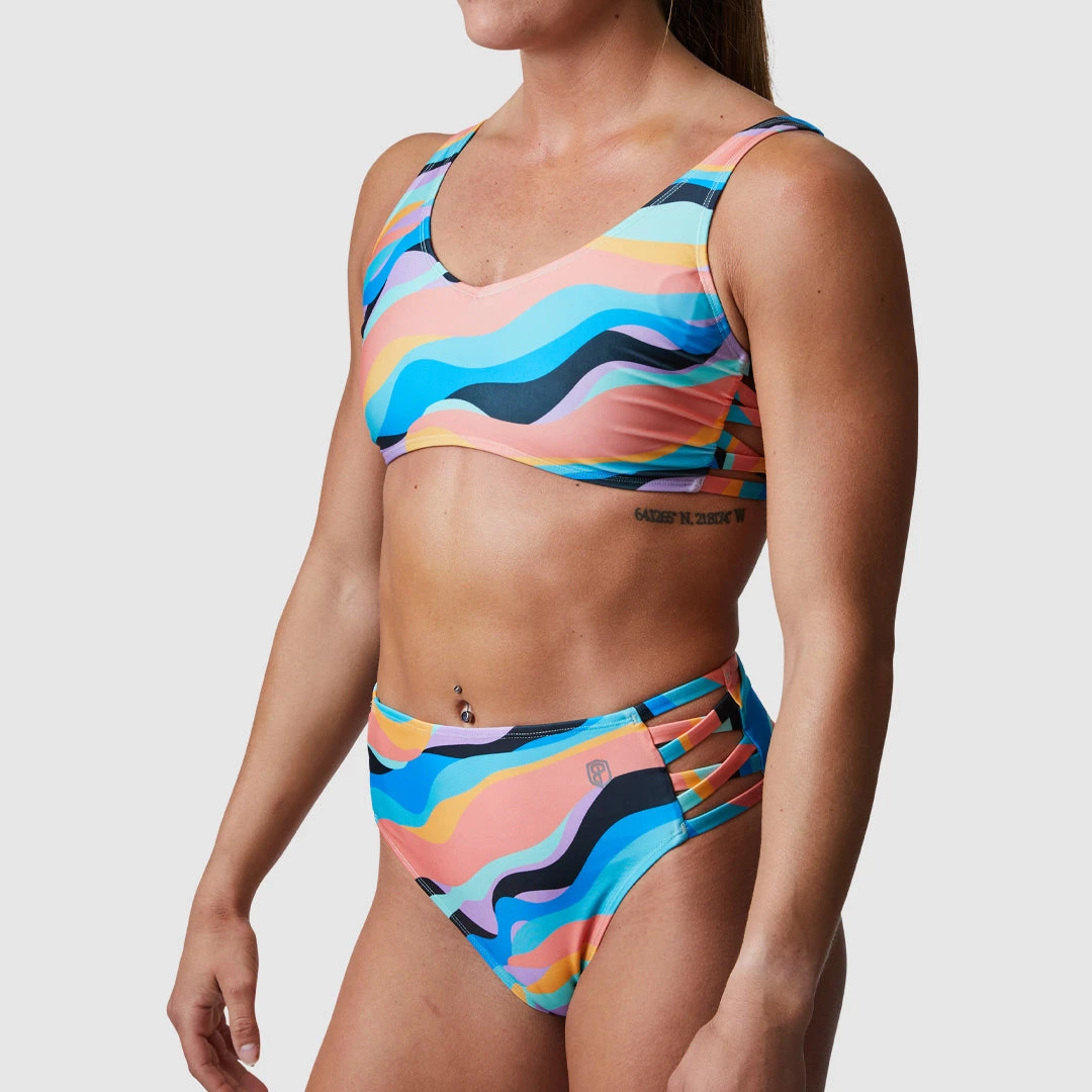 The Sandbar Bikini Bottoms feature a high-rise waist and a cheekier coverage in the back. The sides of these high-waisted bathing suit bottoms have 6 strings for a fun and cute detail. Create a complete look for the beach with our Ripple bikini top.