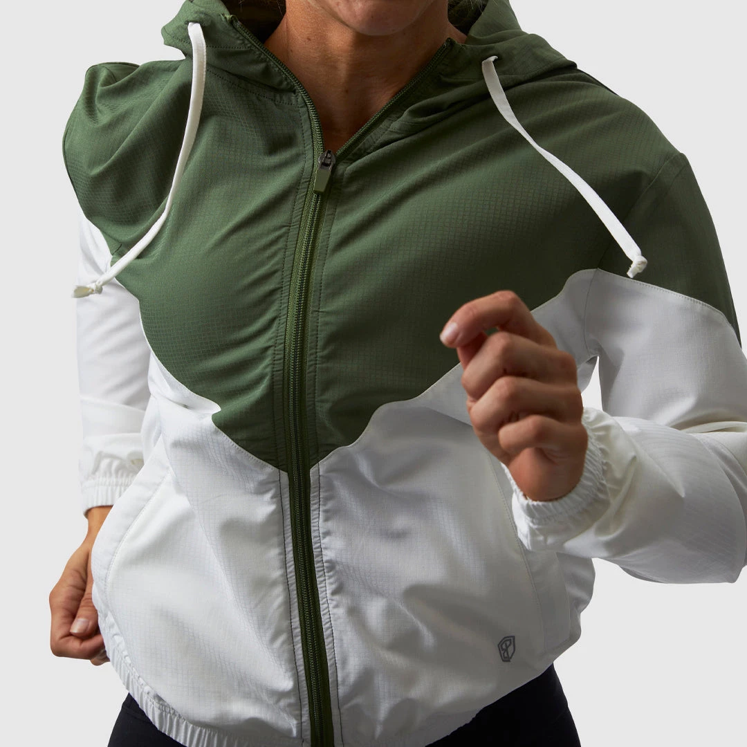 The Ohana Jacket is a part of our Bethany Shadburne Collection. Curated by Bethany herself, it features a retro color-blocked design. This light weight jacket features a full-length zipper, dual front zipper pockets, drawstring hood, and a two-toned color design of white and basil. With an elastic bottom, expect this jacket to be close fitting.