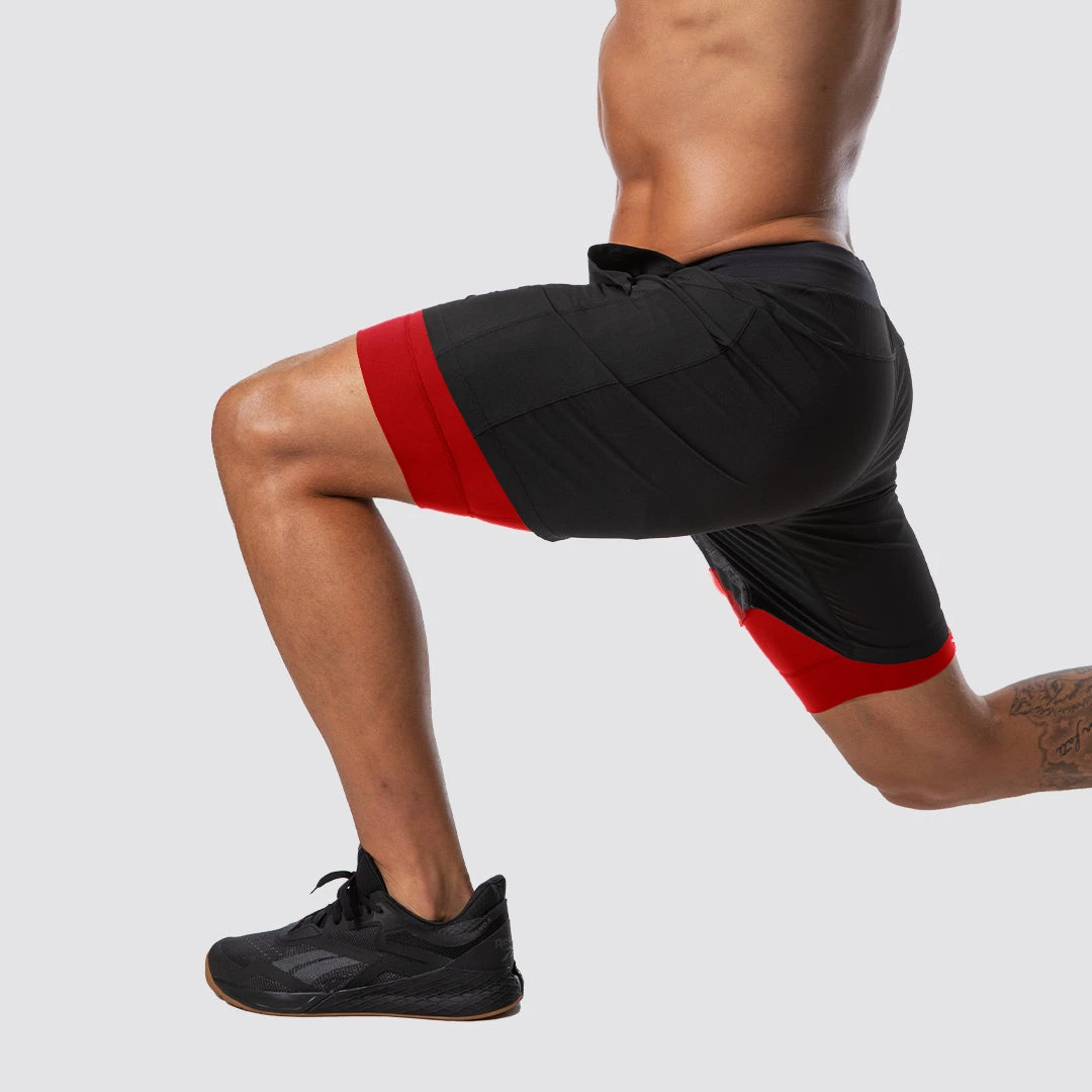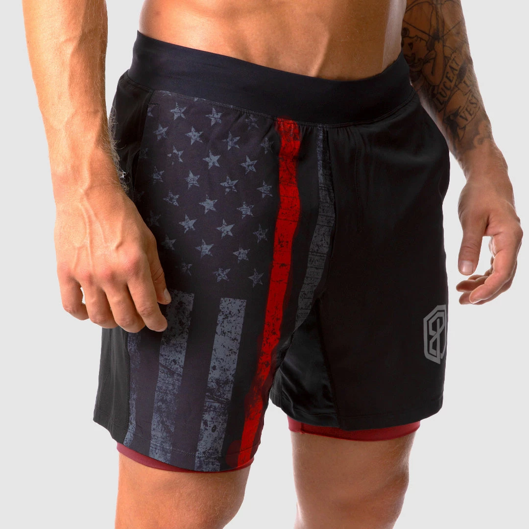 We designed these to be an all-purpose training short with performance in mind. These men’s black athletic shorts with pockets feature built-in compression shorts paired with a lightweight, quick-dry outer short with moderate elasticity to ensure mobility. They feature two pockets in the front and a discrete, low-profile zipper pocket on the back to secure your belongings. The elastic waistband is paired with a drawstring to help keep your shorts secure in any environment. Whether you are hitting the gym, the trail, the water, or the ring, these athletic training shorts will perform. These shorts feature red compression and the Thin Red Line Flag in Gunmetal.