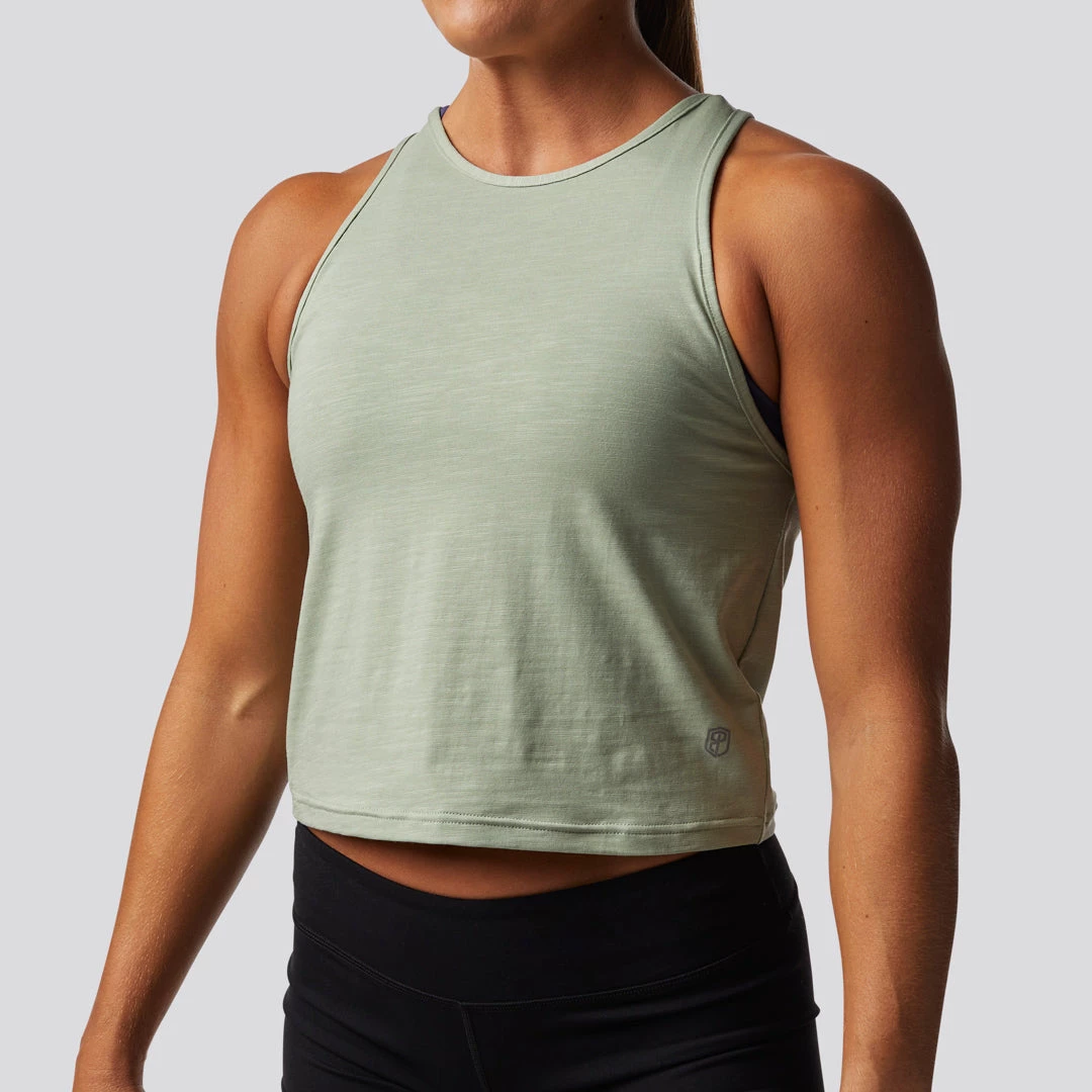 This sleeveless tank features the same cut in the front and the back of the tank. The arm opening is larger and will show your sports bra.
