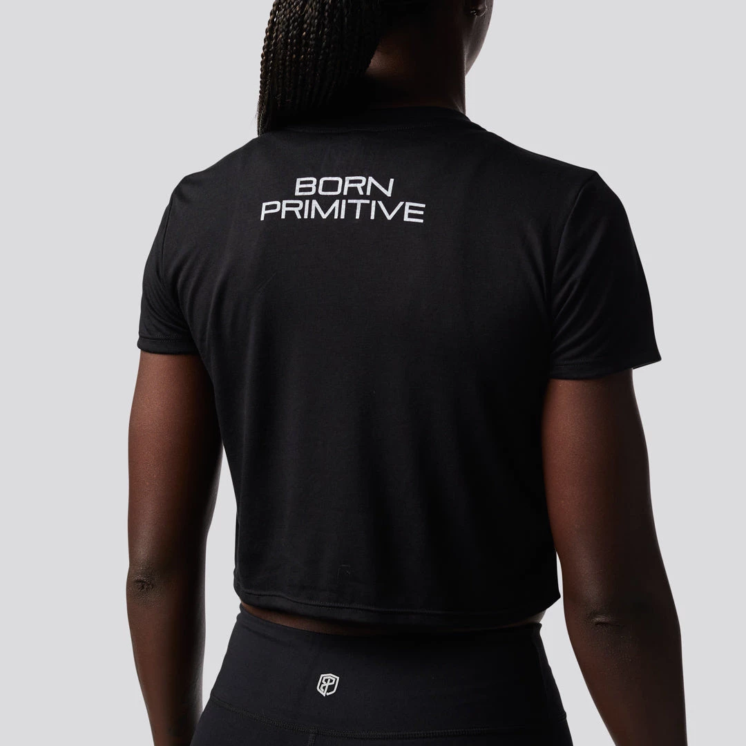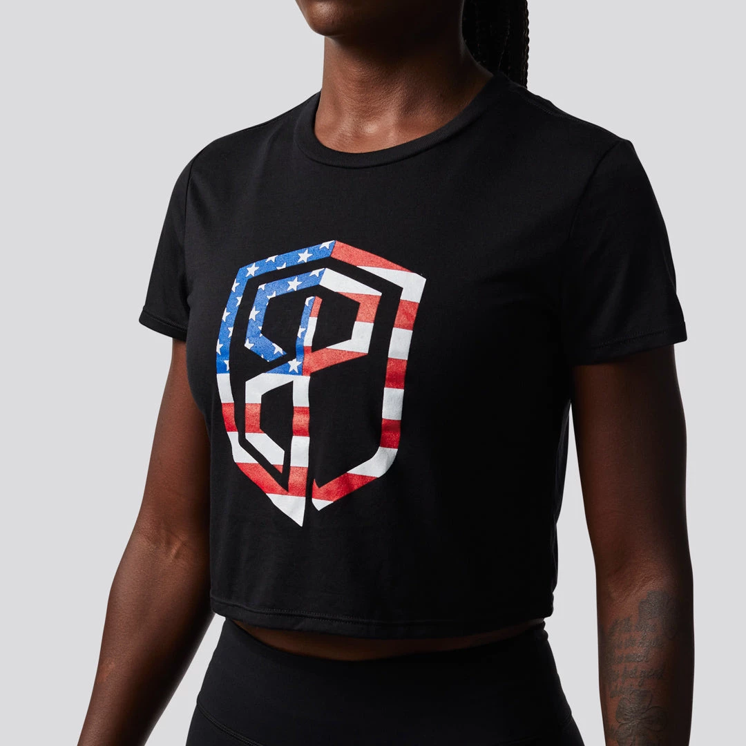 This comfortable, flowy crop gives you plenty of room to move throughout lifts and workout. Featuring our American Flag Born Primitive Logo this is the perfect shirt for Memorial Day, 4th of July and basically every other day of the year!  This modest-crop tee with inset sleeves creates an unforgettable silhouette that you will have to have in your fitness apparel wardrobe!