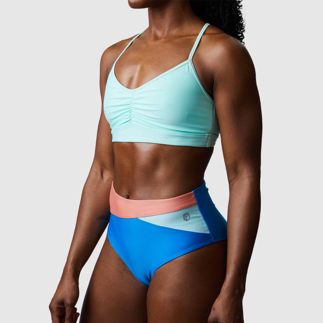 The Tropics Bikini Bottoms feature a high waist with a color block front and medium coverage in the back.